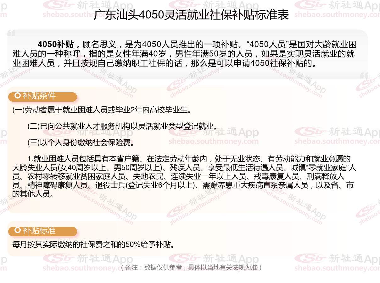 今天聊一下4050补贴话题。4050补贴听起来像是一个针对特定年龄人群的社保补贴。比如女性需年满40周岁,男性需年满50周岁(以申请当年12月31日为截止日期)。那么广东汕头4050灵活就业社保补贴标准是多少钱?广东汕头4050社保补贴条件是什么?接下来随新社通APP小编了解一下最新资讯。