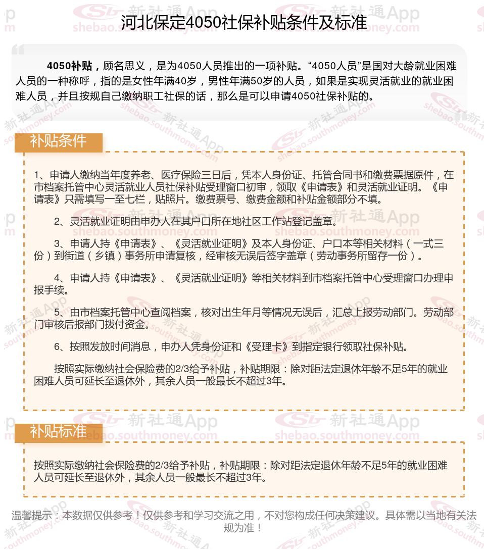 今天聊一下4050补贴的相关内容。4050补贴听起来像是一个针对特定年龄人群的社保补贴。比如女性需年满40周岁,男性需年满50周岁(以申请当年12月31日为截止日期)。那么河北保定4050灵活就业困难人员社保补贴多少钱?河北保定4050社保补贴可以申请吗?接下来随新社通APP小编具体了解一下4050社保补贴内容。