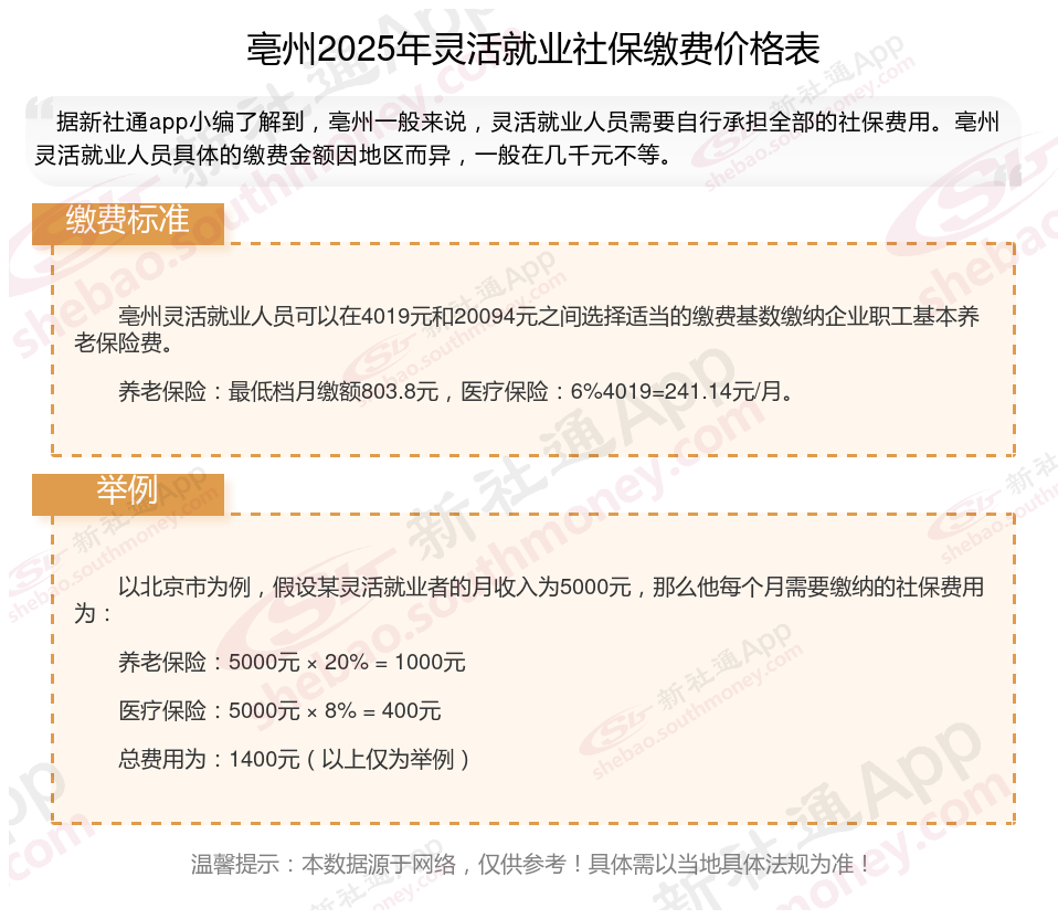 据新社通app数据显示,亳州灵活就业养老保险的缴费基数为:4227元。灵活就业人员参保缴费的比例为个人20%。