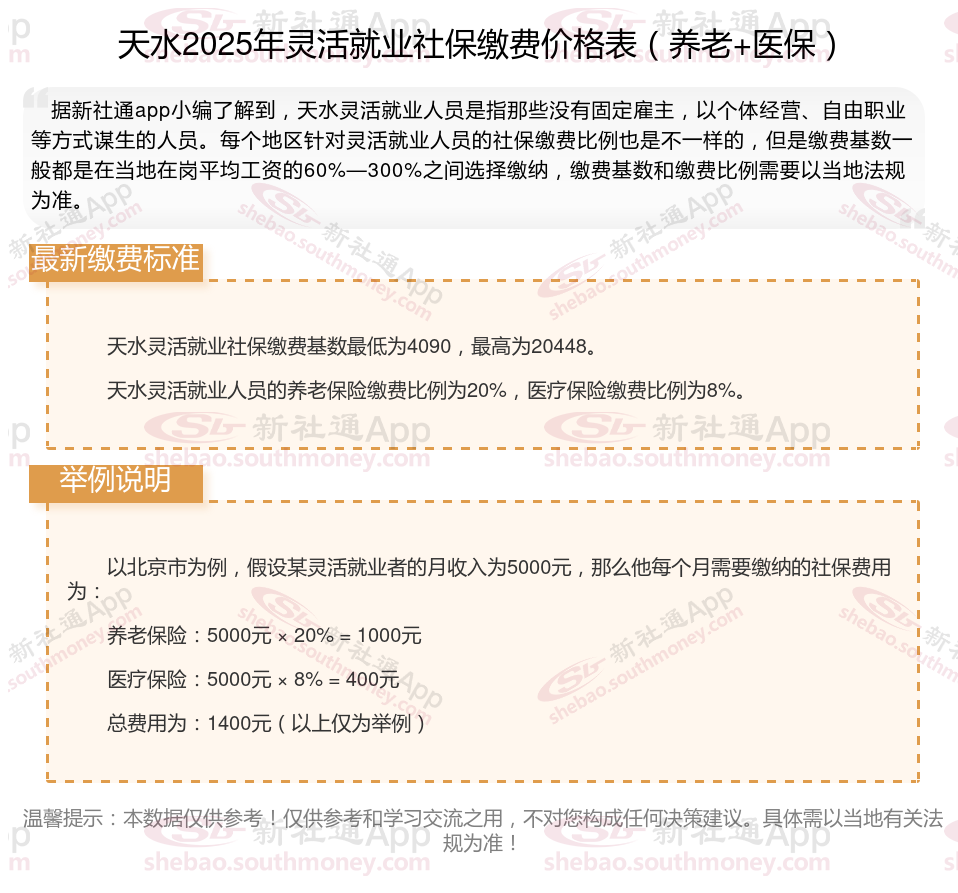 据新社通app数据显示,天水灵活就业养老保险缴费基数2024-2025年最新标准如下:
