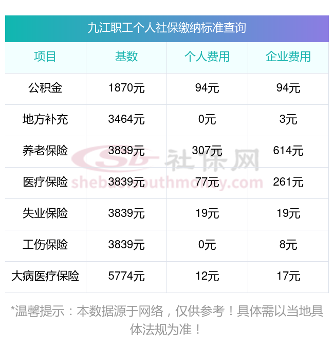 2025年九江社保缴费多少钱?下表是2023-2024年九江社保费用明细参考,新社通app-社保缴费查询工具提供的最新数据如下: