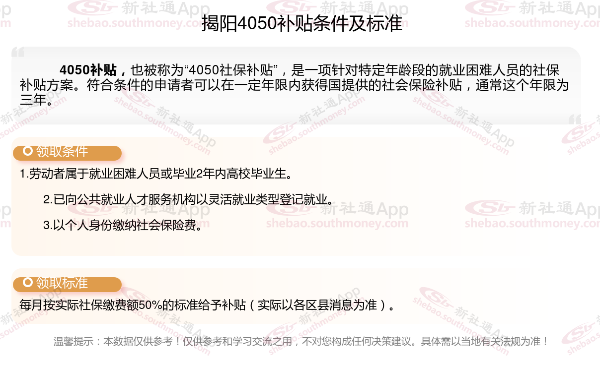 2025揭阳4050补贴主要针对的是年龄在40岁以上的女性和50岁以上的男性,这些人群通常因为年龄较大而面临就业困难。