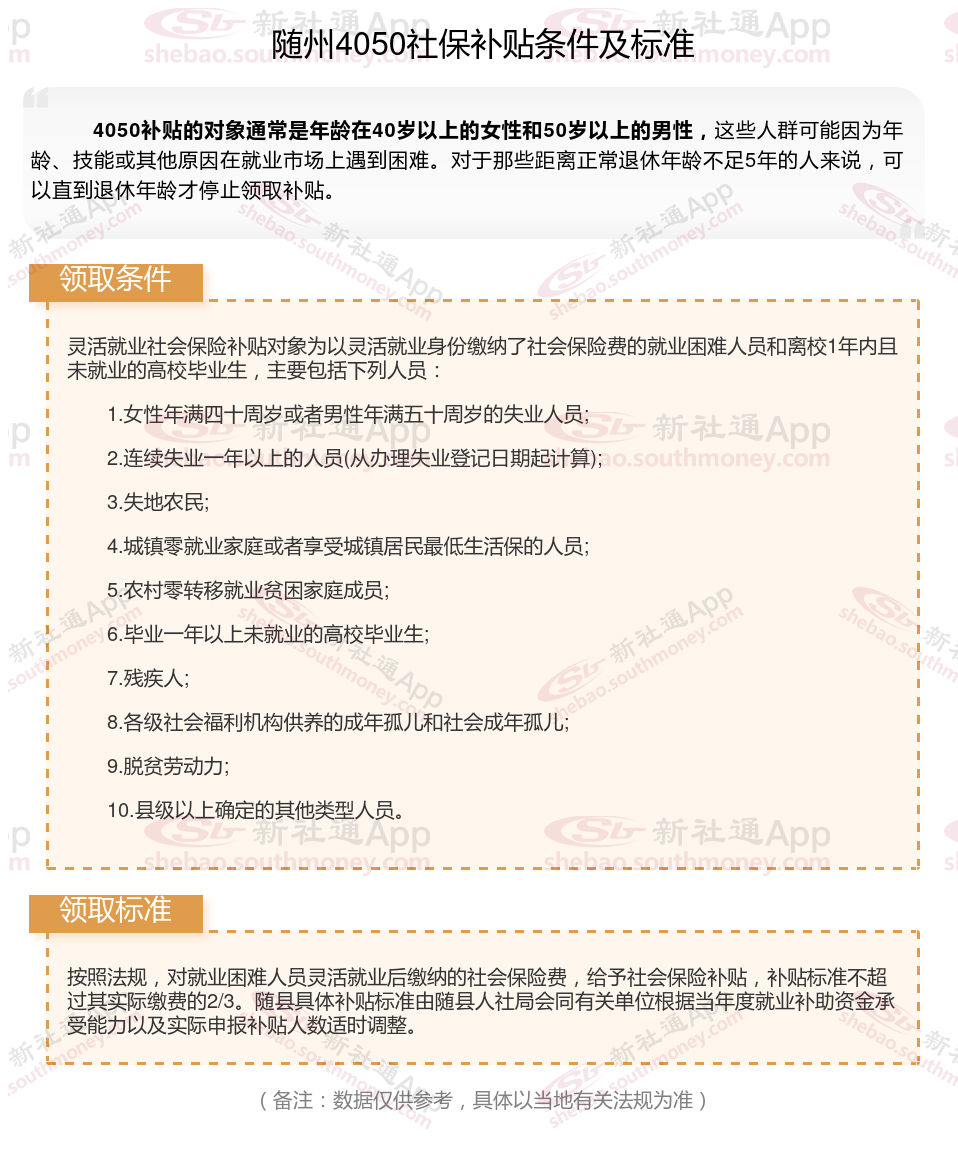 二、随州灵活就业4050社保补贴标准及条件是什么
