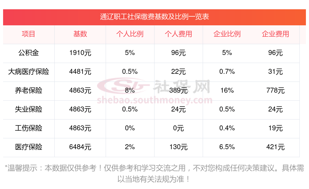 2025年通辽社保缴费多少钱?下表是2024-2025年通辽社保费用明细参考,新社通app-社保缴费查询工具提供的最新数据如下: