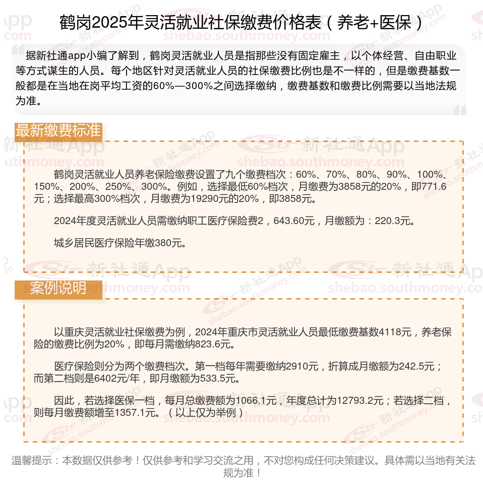 据新社通app数据显示,鹤岗灵活就业人员养老保险缴费基数2024-2025年最新标准如下: