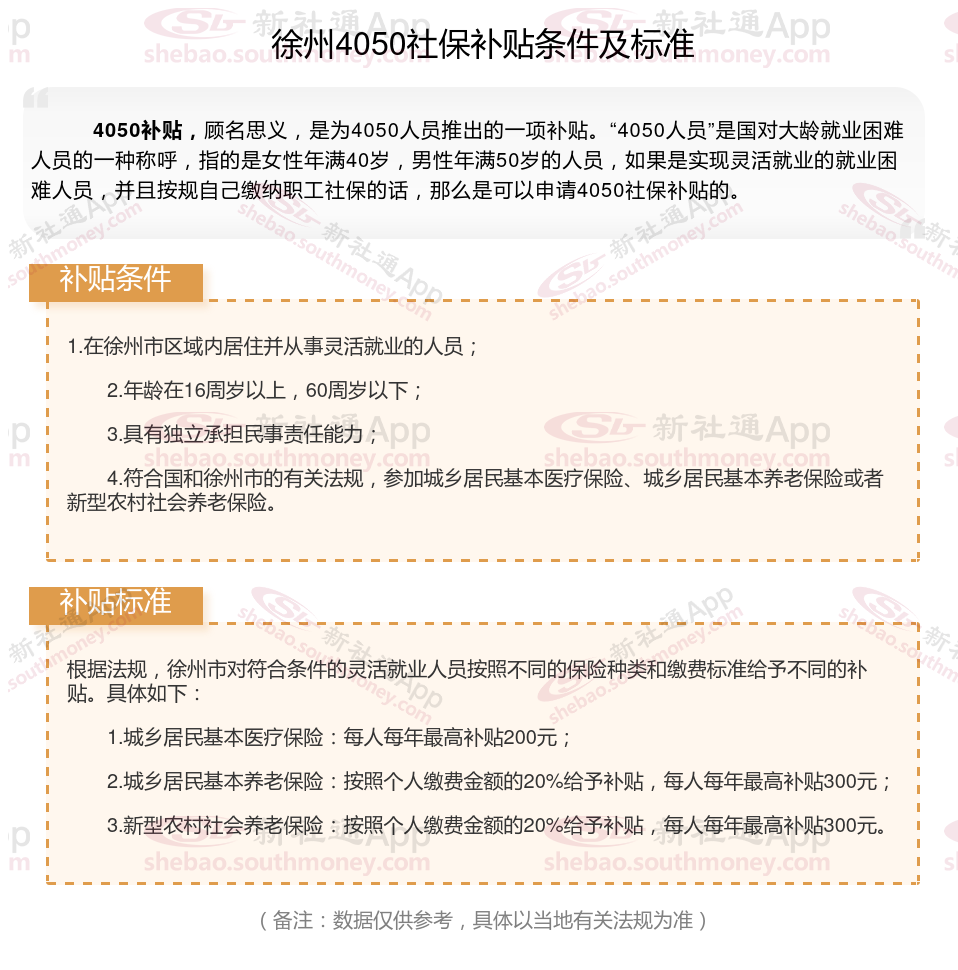 今天聊一下4050补贴的相关内容。4050补贴听起来像是一个针对特定年龄人群的社保补贴。比如女性需年满40周岁,男性需年满50周岁(以申请当年12月31日为截止日期)。那么徐州4050灵活就业困难人员社保补贴多少钱?徐州4050社保补贴可以申请吗?接下来随新社通APP小编具体了解一下4050社保补贴内容。