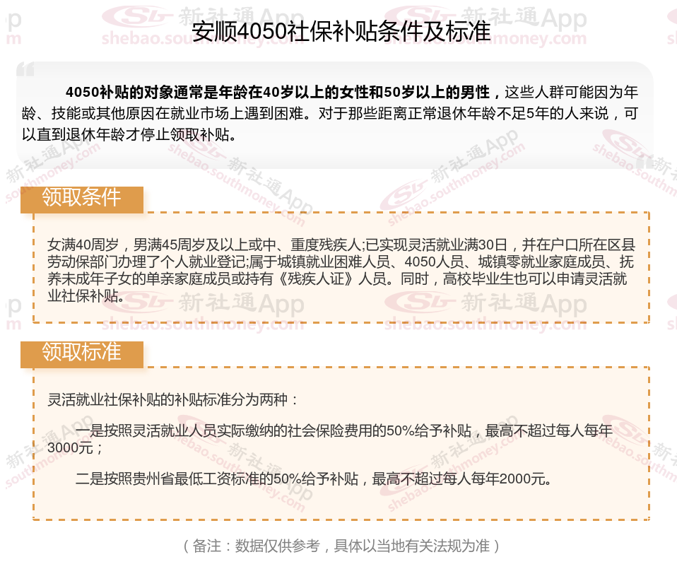 今天聊一下4050补贴的相关内容。4050补贴听起来像是一个针对特定年龄人群的社保补贴。比如女性需年满40周岁,男性需年满50周岁(以申请当年12月31日为截止日期)。那么安顺4050灵活就业困难人员社保补贴多少钱?安顺4050社保补贴可以申请吗?接下来随新社通APP小编具体了解一下4050社保补贴内容。