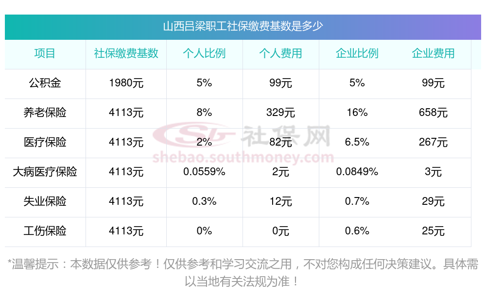 山西吕梁社保缴纳比例由企业和个人共同承担,具体比例如下: