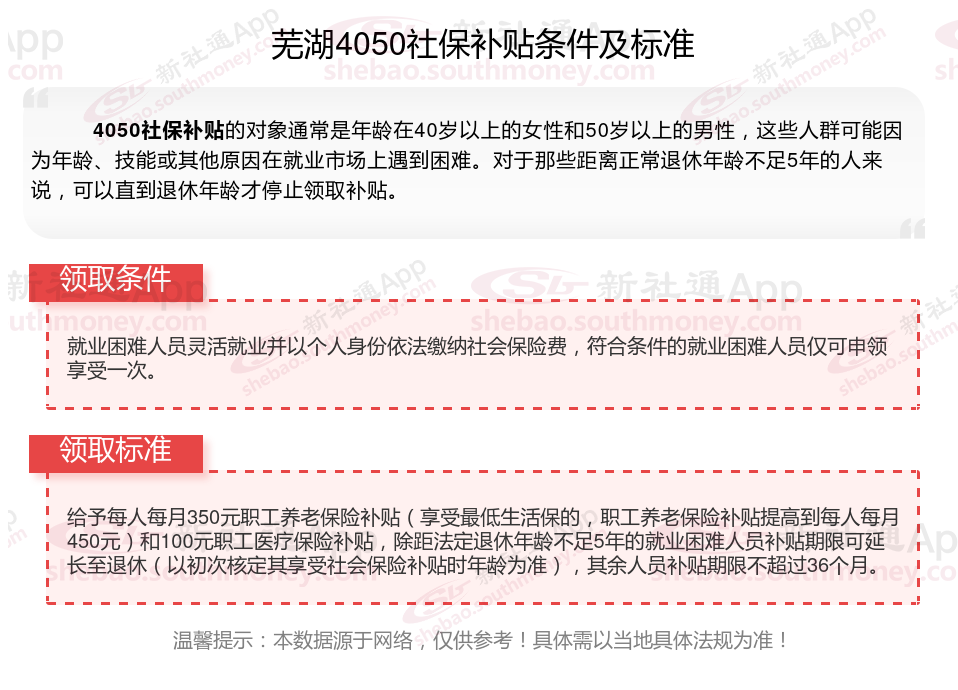 2025芜湖4050补贴主要针对的是年龄在40岁以上的女性和50岁以上的男性,这些人群通常因为年龄较大而面临就业困难。