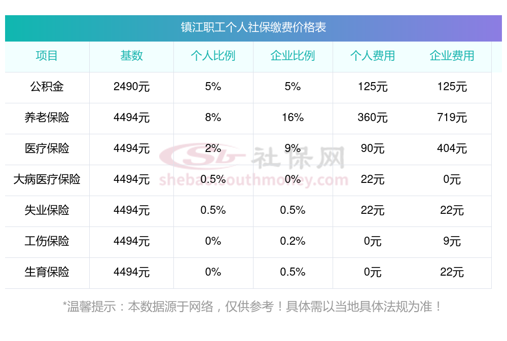 2025年镇江社保缴费价格,2025年镇江社保缴费多少钱?下表是2025年镇江社保费用明细参考,新社通app-社保缴费查询工具提供的最新数据如下: