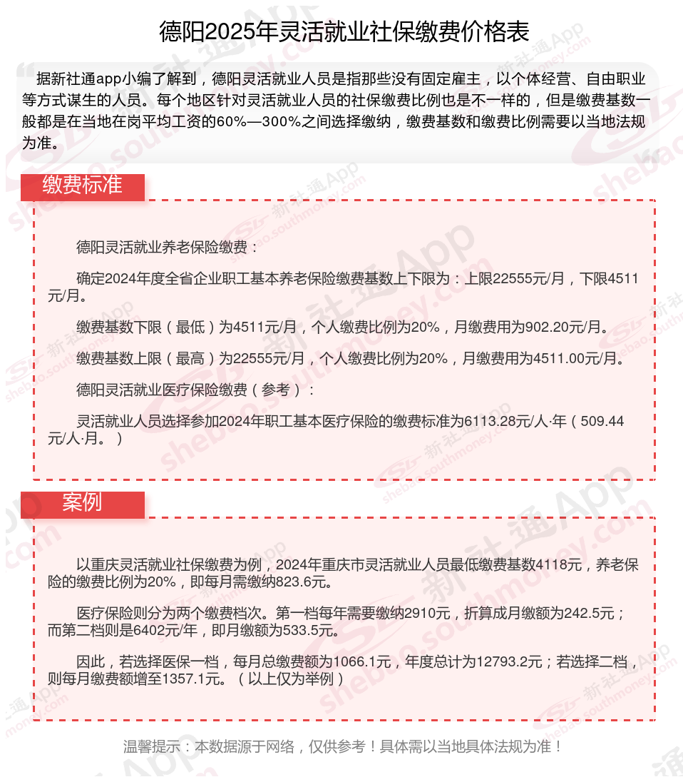 据新社通app数据显示,德阳灵活就业养老保险缴费基数2024-2025年最新标准如下: