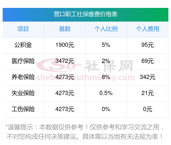 营口五险一金交多少钱一个月?下表是2024-2025年营口社保费用明细参考,新社通app-社保缴费查询工具提供的最新数据如下: