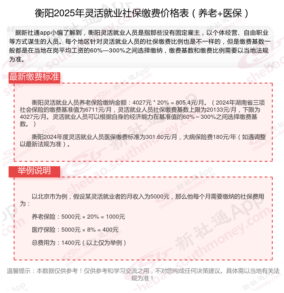 衡阳灵活就业社保缴费标准,衡阳社保缴费多少钱?下表是2024-2025年衡阳社保费用明细参考,根据新社通app-社保缴费查询工具提供的最新数据如下: