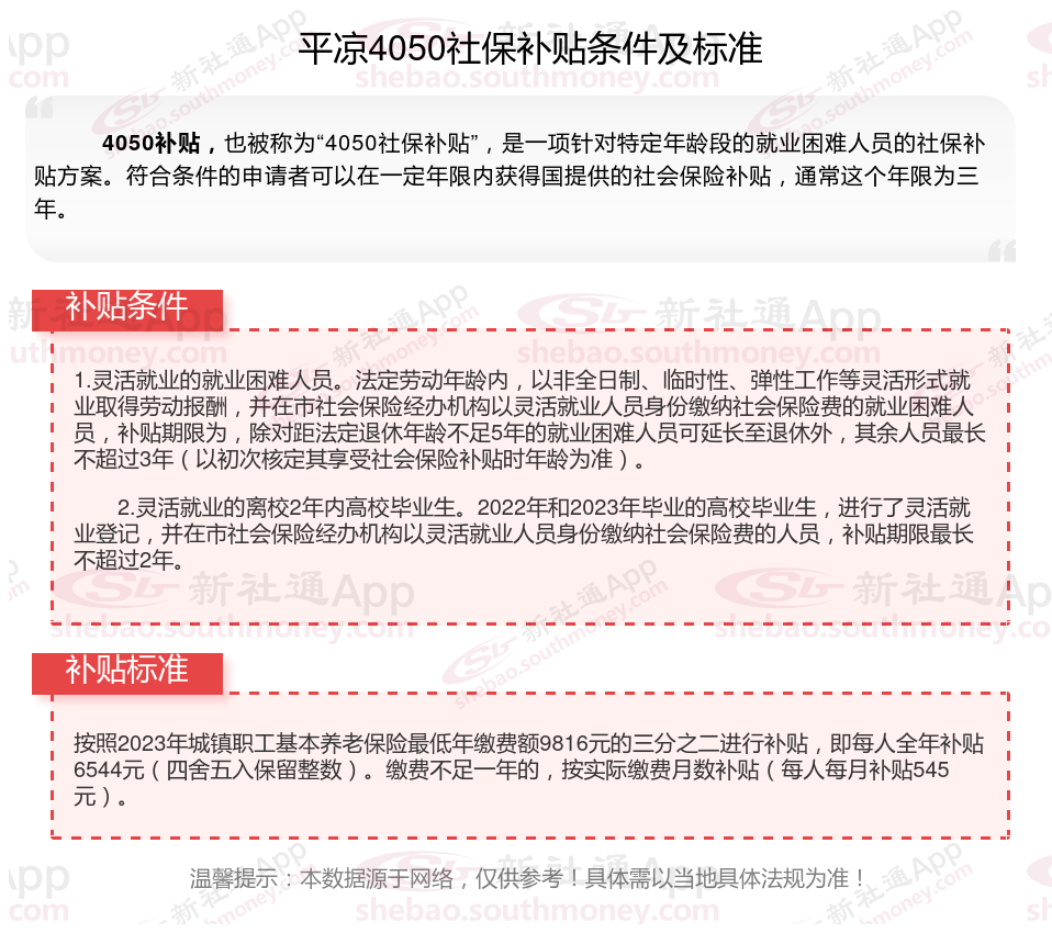 以上就是平凉4050灵活就业困难人员社保补贴的相关内容,欢迎关注新社通/下载新社通APP了解更多五险一金专业资讯。