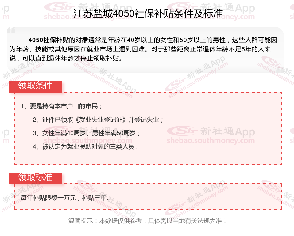 二、2025年江苏盐城4050社保补贴多少钱?4050社保补贴领取条件什么?