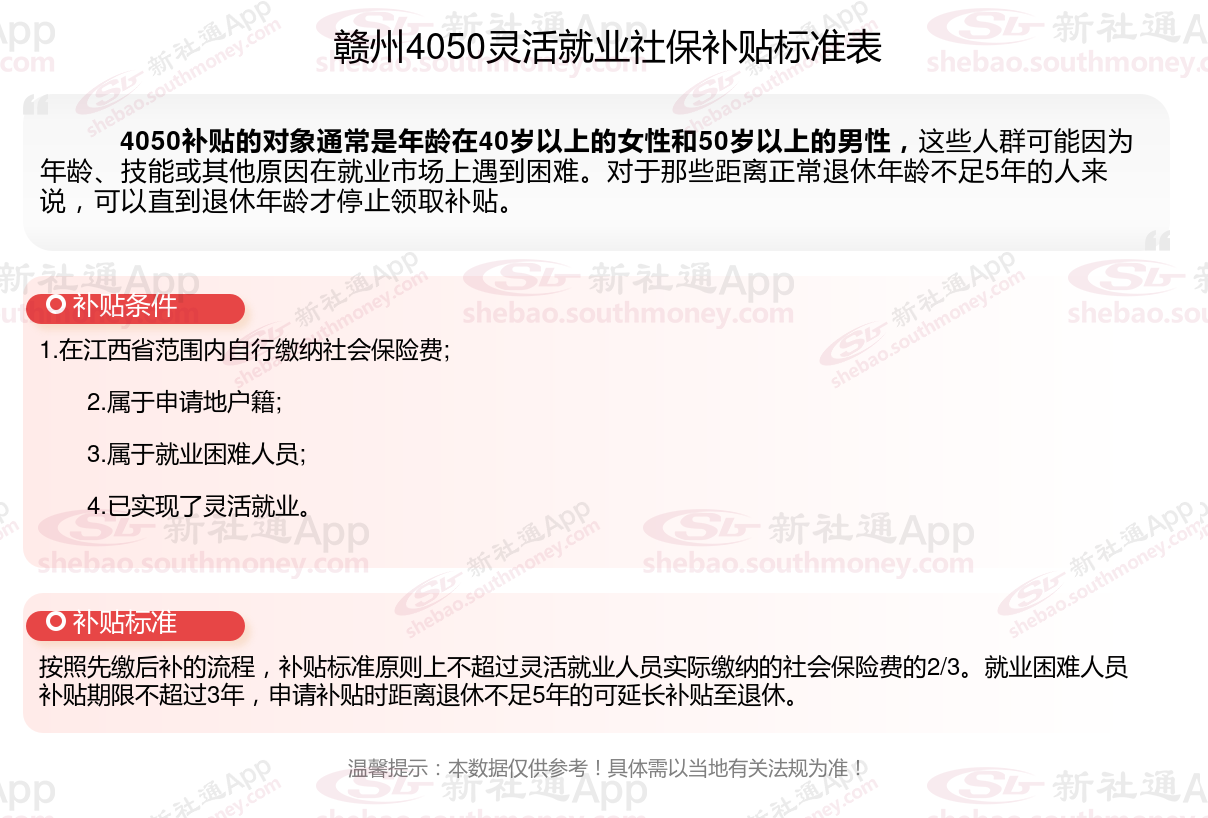 以上就是赣州4050灵活就业社保补贴的相关内容,欢迎关注新社通/下载新社通APP了解更多五险一金专业资讯。