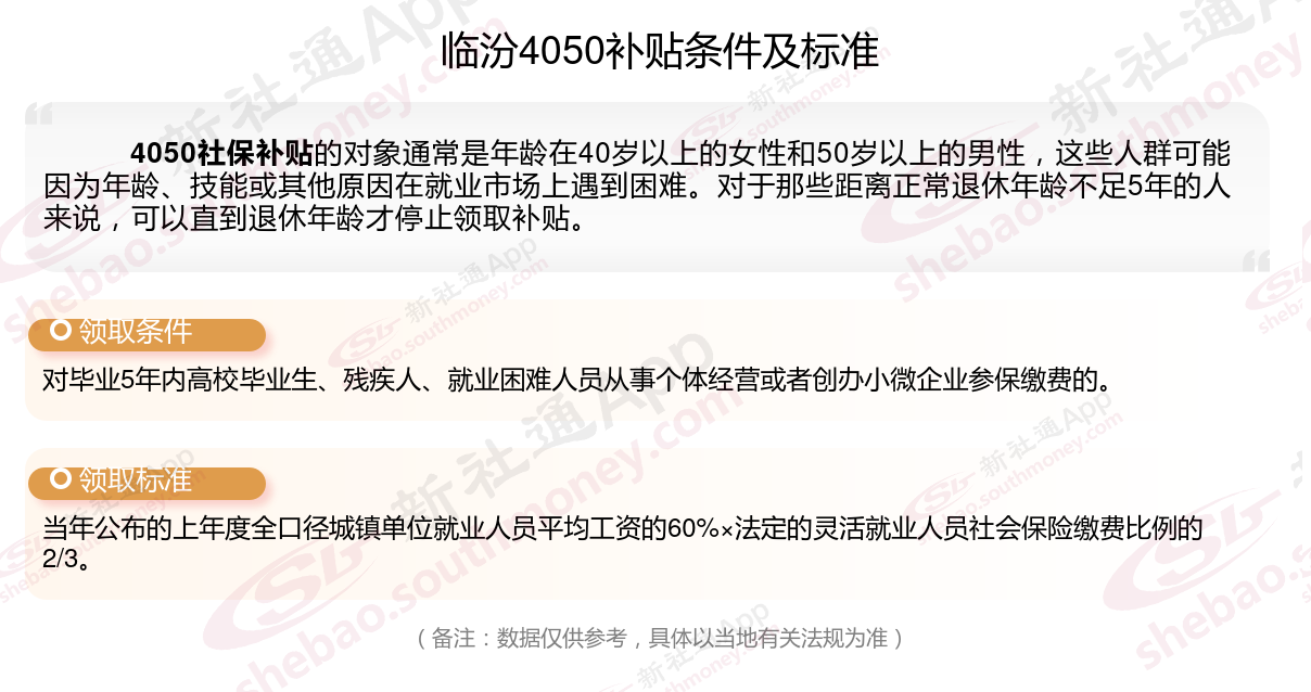 2025临汾4050补贴主要针对的是年龄在40岁以上的女性和50岁以上的男性,这些人群通常因为年龄较大而面临就业困难。