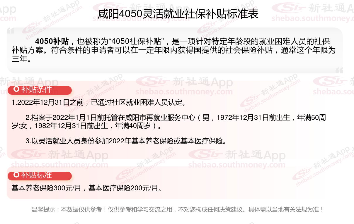 2025咸阳灵活就业4050社保补贴是一项面向特定年龄段的就业困难人群的社会保险补贴。