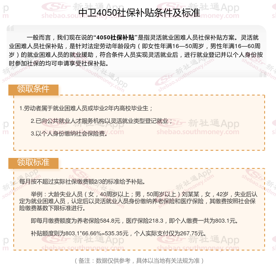 4050社保补贴标准据新社通app小编了解,通常,4050社保补贴包含基本医疗保险和基本养老保险两个险种,社保补贴金额为申请人实际缴纳基本养老保险和基本医疗保险金额的2/3,具体标准以当地社保局公布的数据为准!那么中卫灵活就业人员4050补贴最新标准是多少,中卫4050灵活就业人员社保补贴一年可以有多少钱?接下来随新社通APP小编具体了解一下4050社保补贴内容。
