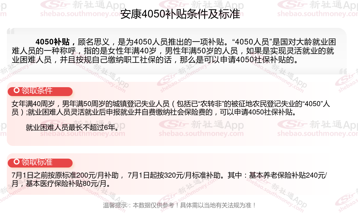 2025安康4050补贴主要针对的是年龄在40岁以上的女性和50岁以上的男性,这些人群通常因为年龄较大而面临就业困难。