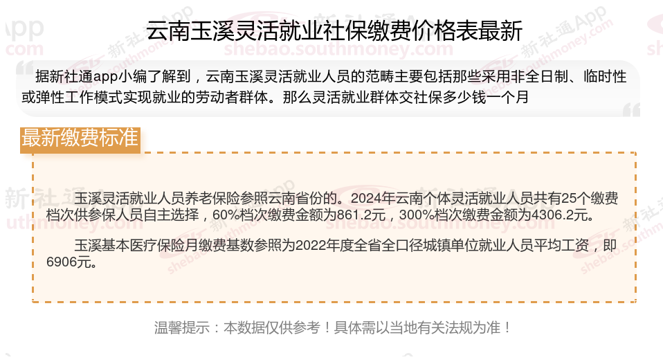 云南玉溪灵活就业人员的社保缴费标准是多少?根据新社通app-社保缴费查询工具提供的最新数据如下: