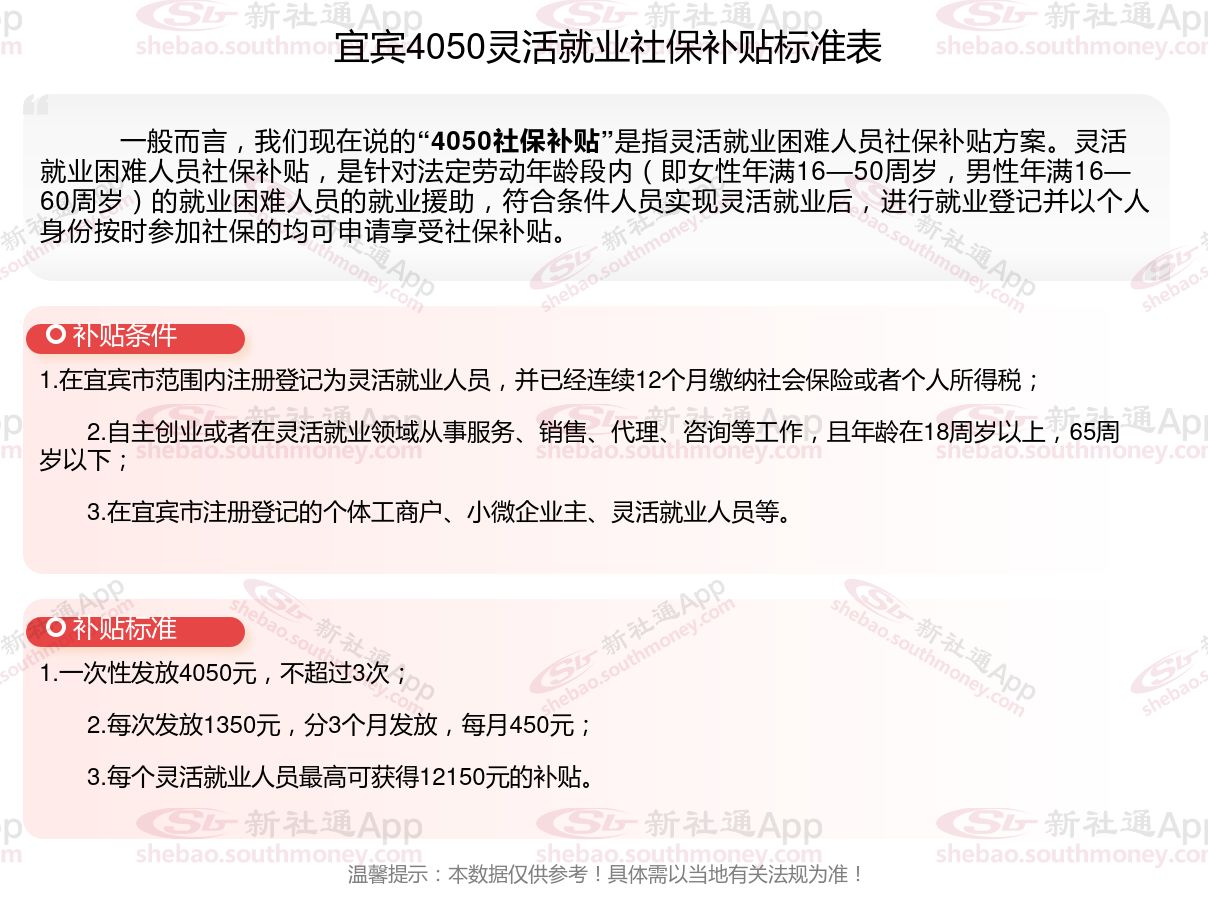 4050补贴主要是针对大龄就业困难人群的社保补贴,申请条件包括年龄、就业困难、灵活就业并自费缴纳社保,需要持有失业登记证,不同地区可能有细微差别,比如农村户口的限制。那么宜宾4050灵活就业社保补贴标准是多少钱?宜宾4050社保补贴条件是什么?接下来随新社通APP小编了解一下最新资讯。
