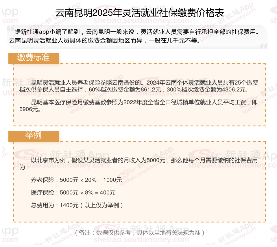 据新社通app数据显示,云南昆明灵活就业人员养老保险缴费基数2024-2025年最新标准如下: