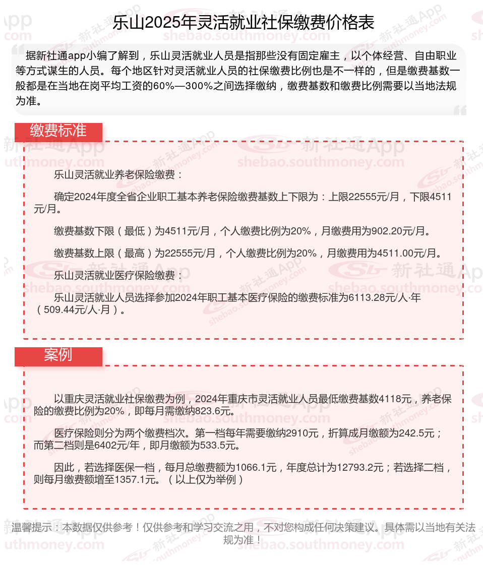 据新社通app数据显示,乐山灵活就业养老缴费基数明细如下: