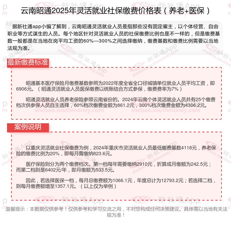 2025年云南昭通灵活就业缴费标准个人交多少呢, 个人是可以自己交社保的吗?根据新社通app-社保缴费查询工具提供的最新数据如下: