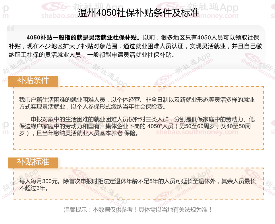 4050补贴主要是针对大龄就业困难人群的社保补贴,申请条件包括年龄、就业困难、灵活就业并自费缴纳社保,需要持有失业登记证,不同地区可能有细微差别,比如农村户口的限制。那么温州4050灵活就业社保补贴标准是多少钱?温州4050社保补贴条件是什么?接下来随新社通APP小编了解一下最新资讯。