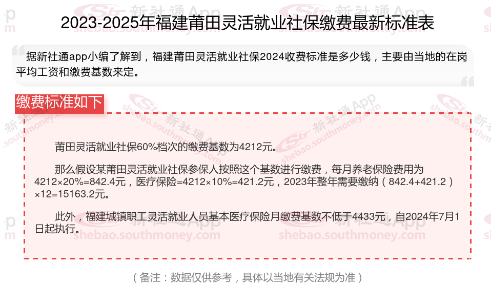 据新社通app数据显示,福建莆田灵活就业养老保险的缴费基数为:4212元。灵活就业人员参保缴费的比例为个人20%。