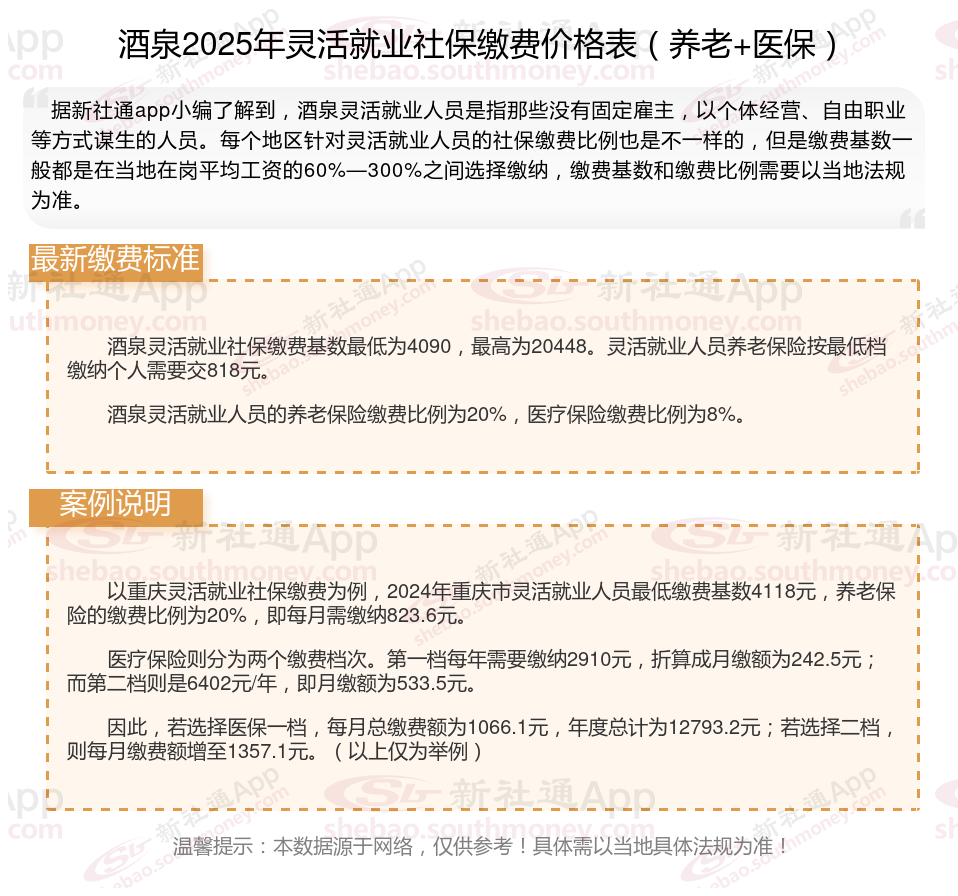 据新社通app数据显示,酒泉灵活就业人员养老保险缴费基数2024-2025年最新标准如下: