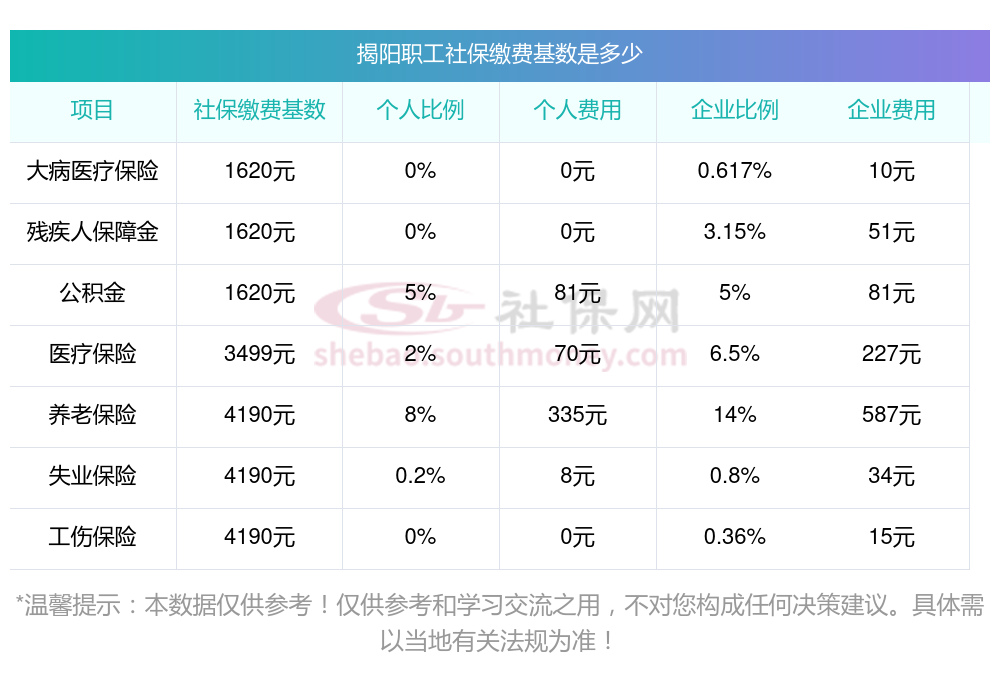 揭阳社保个人缴费比例是多少?和社保丫丫一起来看看2024-2025年揭阳最低社保费用明细参考,新社通app-社保缴费查询工具提供的最新数据如下: