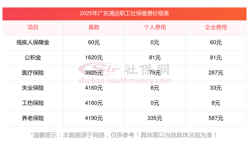 2025年广东清远社保缴纳比例,2025年广东清远社保缴费多少钱?下表是2024-2025年广东清远社保费用明细参考,新社通app-社保缴费查询工具提供的最新数据如下: