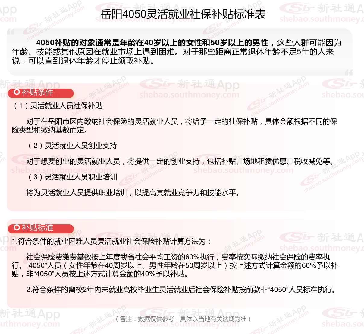 2025岳阳灵活就业4050社保补贴是一项面向特定年龄段的就业困难人群的社会保险补贴。