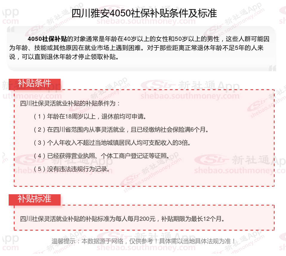 4050补贴主要是针对大龄就业困难人群的社保补贴,申请条件包括年龄、就业困难、灵活就业并自费缴纳社保,需要持有失业登记证,不同地区可能有细微差别,比如农村户口的限制。那么四川雅安4050灵活就业社保补贴标准是多少钱?四川雅安4050社保补贴条件是什么?接下来随新社通APP小编了解一下最新资讯。
