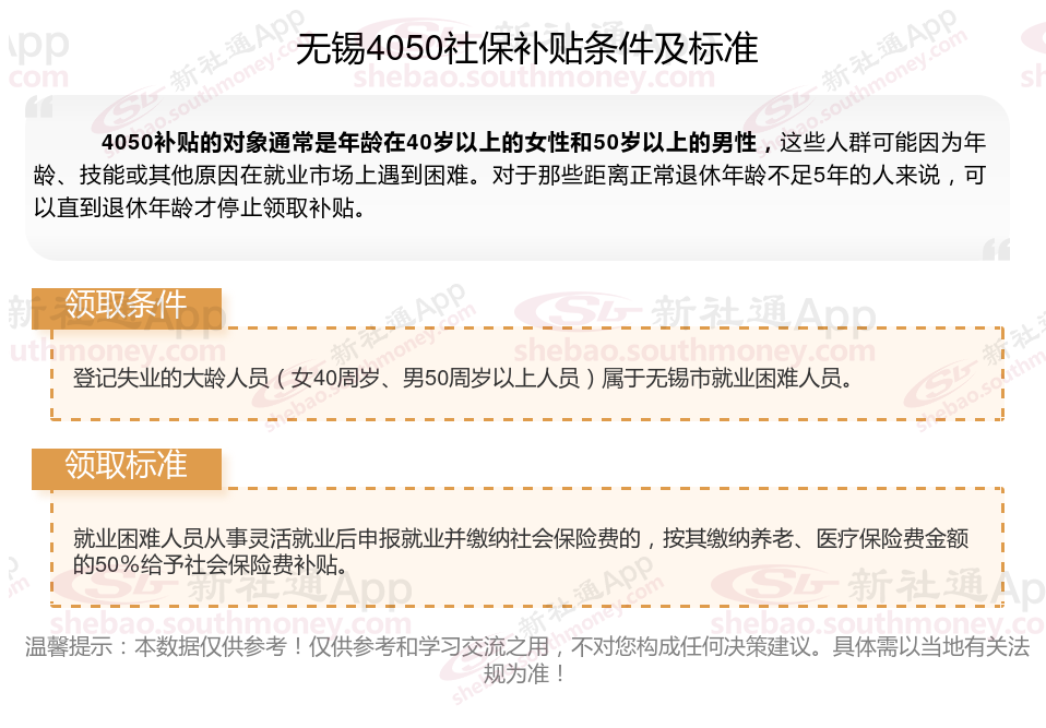 2025无锡4050补贴主要针对的是年龄在40岁以上的女性和50岁以上的男性,这些人群通常因为年龄较大而面临就业困难。