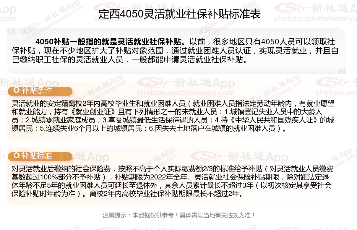 “灵活就业4050社保补贴”需要以灵活就业身份参加职工养老和医疗保险,补贴标准不超过实际缴费的三分之二,最长3年,距离退休不足5年的可延长到退休。补贴对象包括国企下岗人员、低保家庭等。申请流程需要提交身份证、银行账户等。那么定西4050灵活就业困难人员社保补贴标准是多少?定西4050社保补贴需要符合什么条件?接下来随新社通APP小编具体了解一下4050社保补贴内容。