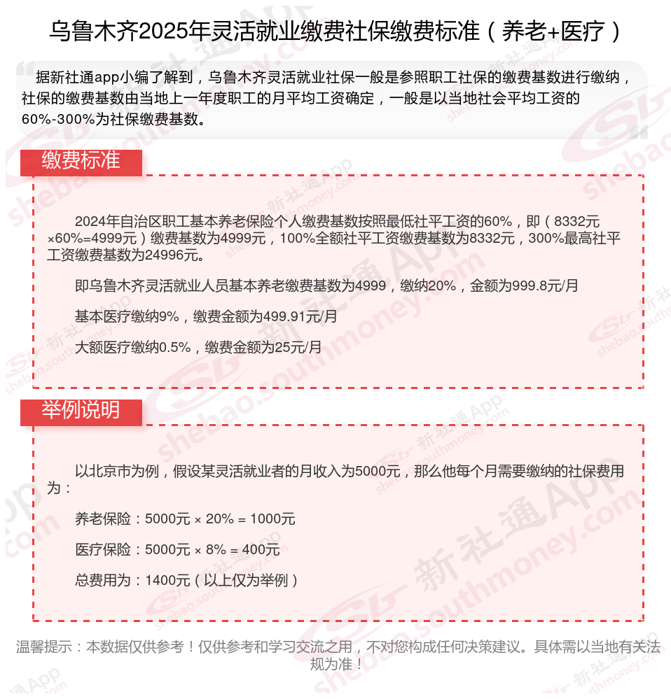 即乌鲁木齐灵活就业人员基本养老缴费基数为4999,缴纳20%,金额为999.8元/月