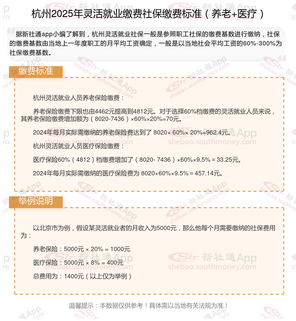 据新社通app数据显示,杭州灵活就业人员养老保险缴费基数2024-2025年最新标准如下: