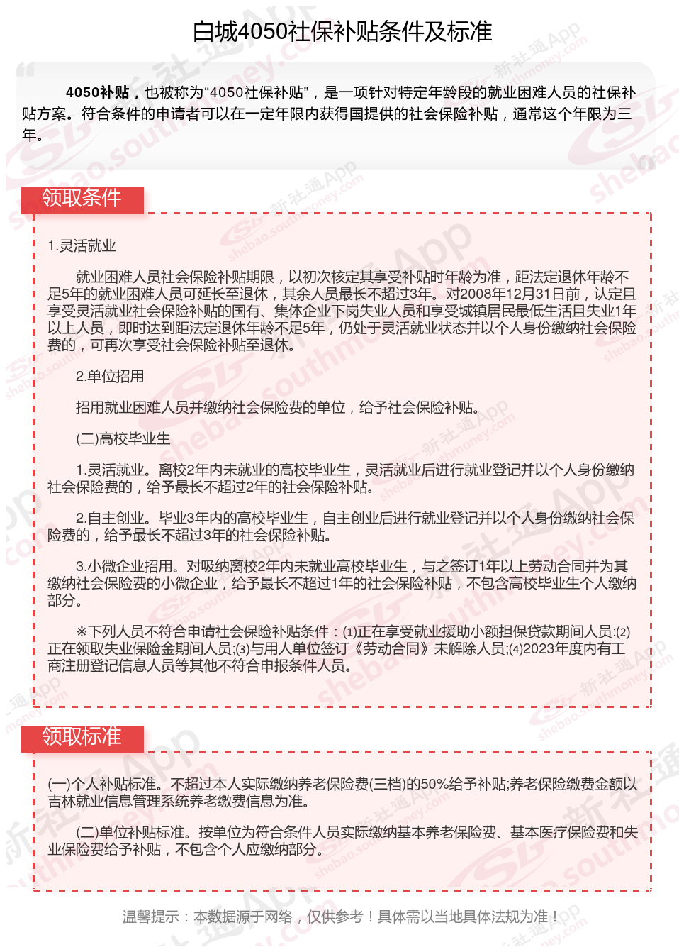 一、2025年白城灵活就业4050社保补贴标准和条件是什么