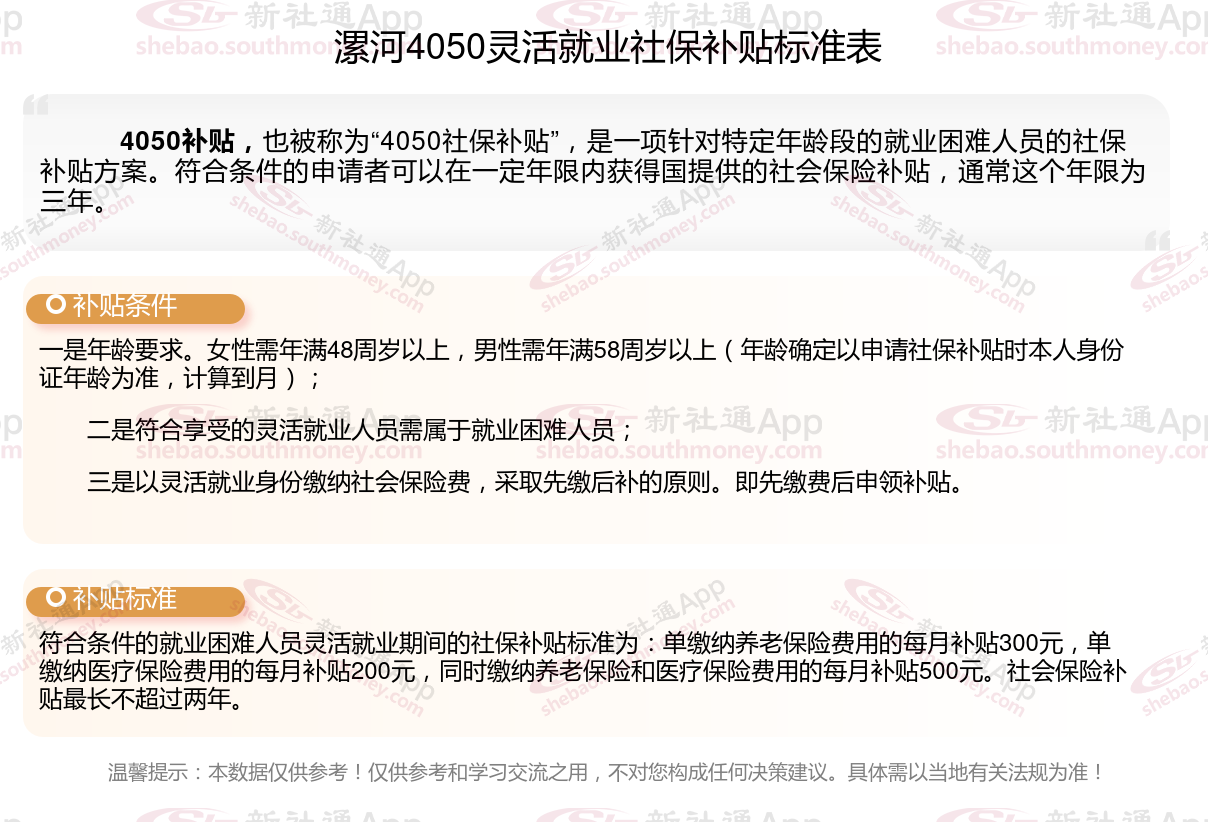 今天聊一下4050补贴的相关内容。4050补贴听起来像是一个针对特定年龄人群的社保补贴。比如女性需年满40周岁,男性需年满50周岁(以申请当年12月31日为截止日期)。那么漯河4050灵活就业困难人员社保补贴多少钱?漯河4050社保补贴可以申请吗?接下来随新社通APP小编具体了解一下4050社保补贴内容。