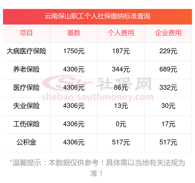 2025年云南保山社保缴费多少钱?下表是2024-2025年云南保山社保费用明细参考,新社通app-社保缴费查询工具提供的最新数据如下:
