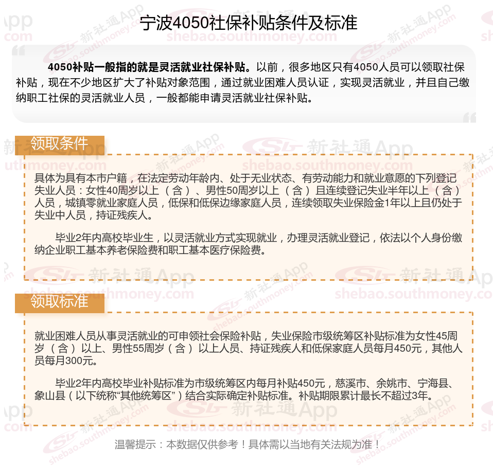 宁波4050灵活就业社保补贴是什么?今天聊一下4050补贴话题。4050补贴听起来像是一个针对特定年龄人群的社保补贴。比如女性需年满40周岁,男性需年满50周岁(以申请当年12月31日为截止日期)。那么宁波4050灵活就业社保补贴标准是多少钱?宁波4050社保补贴可以领取多少?接下来随新社通APP小编了解一下宁波4050灵活就业社保补贴的最新资讯。