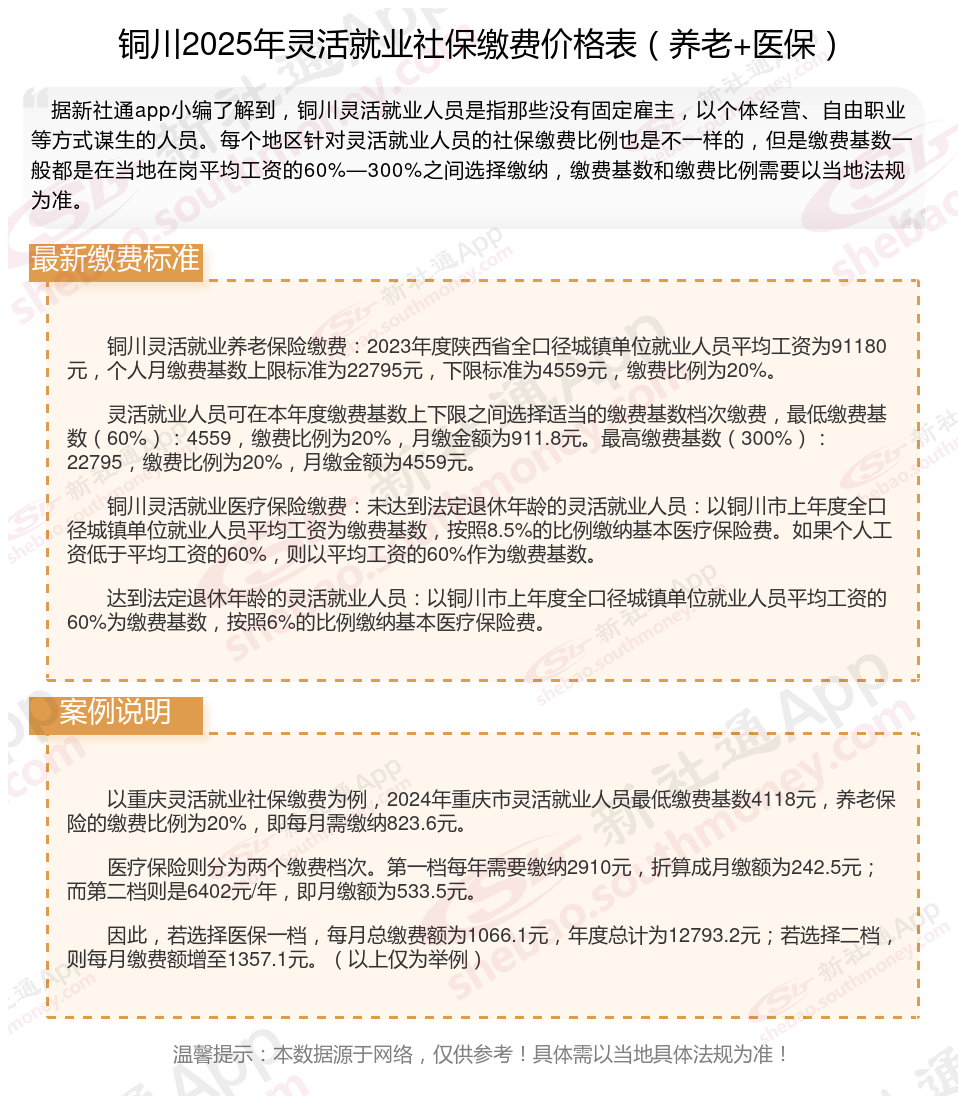 据新社通app数据显示,铜川灵活就业养老保险缴费基数2024-2025年最新标准如下: