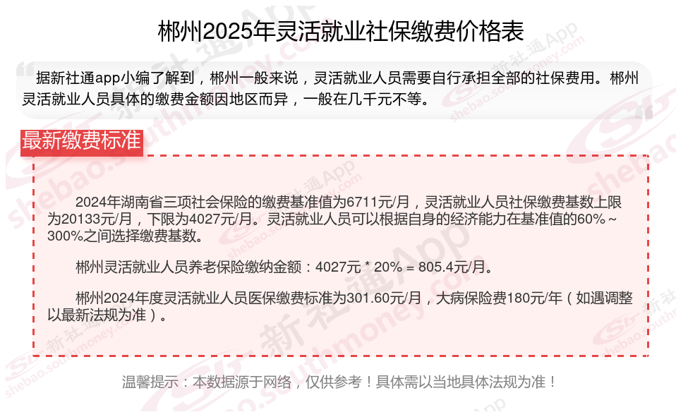 据新社通app数据显示,郴州灵活就业养老保险缴费基数2024-2025年最新标准如下: