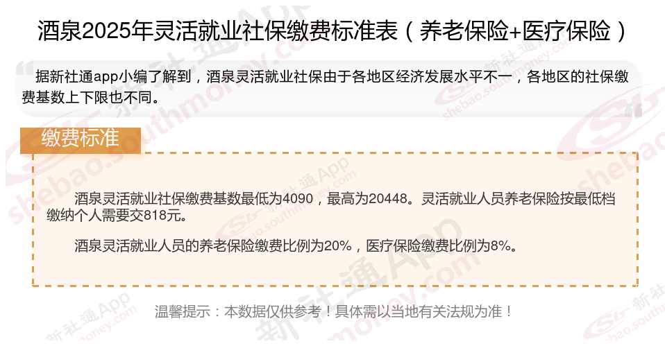 据新社通app数据显示,2024-2025年酒泉灵活就业人员养老保险的缴费标准是根据缴费基数来确定的: