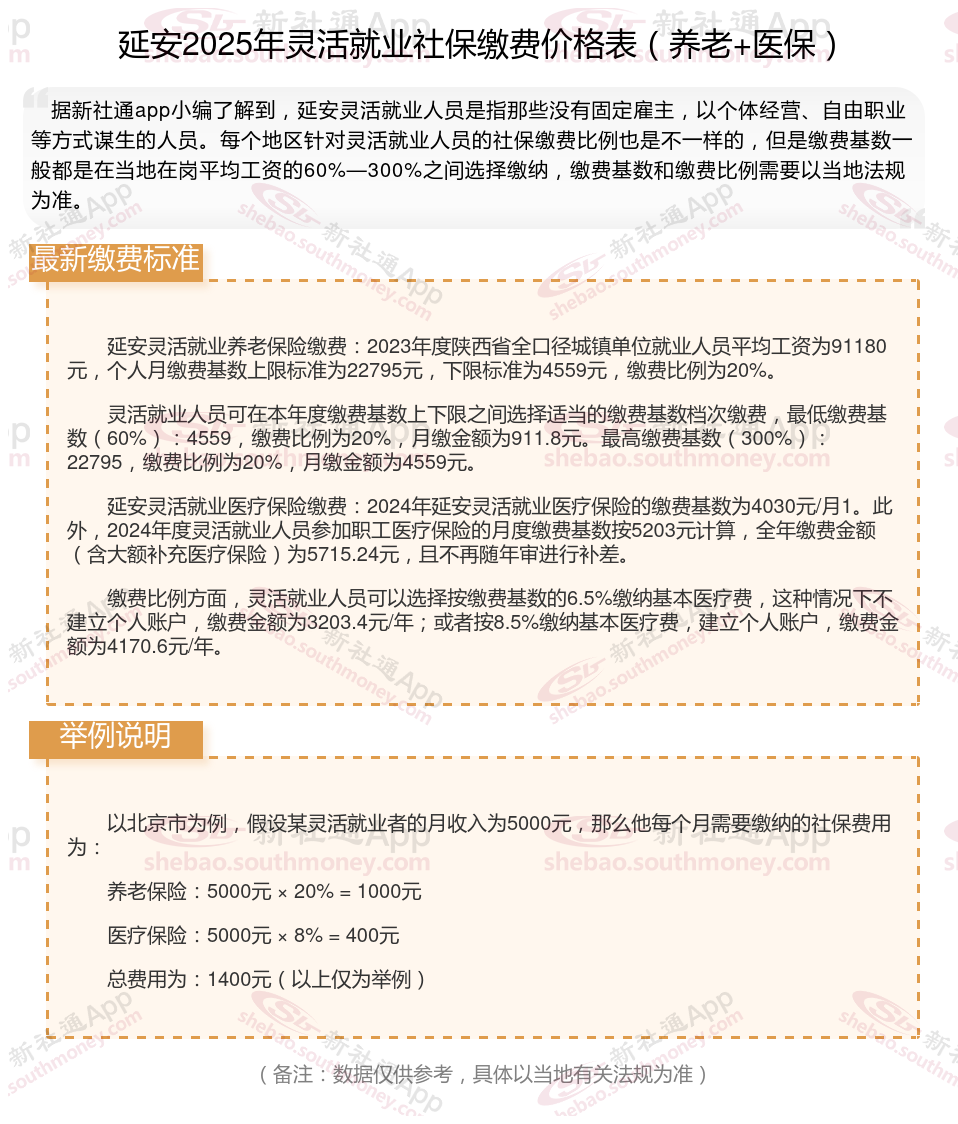 据新社通app数据显示,延安灵活就业养老保险最低缴费基数为:4559元;个人的缴费比例分别为:20%;