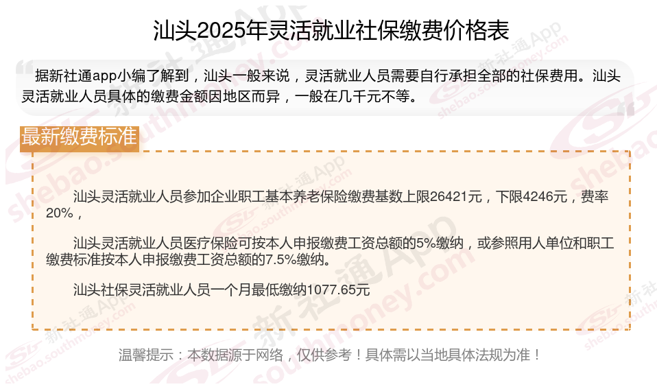 据新社通app数据显示,汕头灵活就业养老保险最低缴费基数为:4246元;个人的缴费比例分别为:20%;