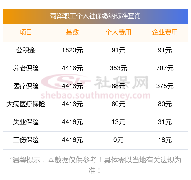 菏泽社保一个月交多少钱,个人可以缴纳社保吗??下面和社保丫丫一起来看看菏泽最低标准社保费用明细参考,新社通app-社保缴费查询工具提供的最新数据如下: